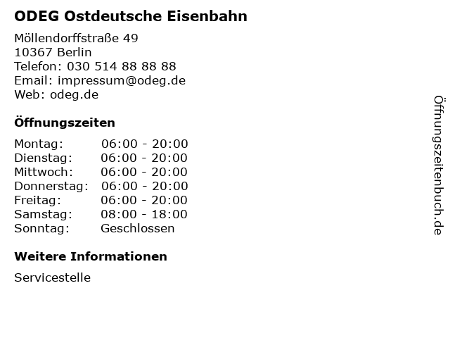 | Öffnungszeiten ODEG Ostdeutsche Eisenbahn in Berlin anzeigen | |