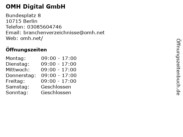 | Öffnungszeiten OMH Digital GmbH in Berlin anzeigen | |