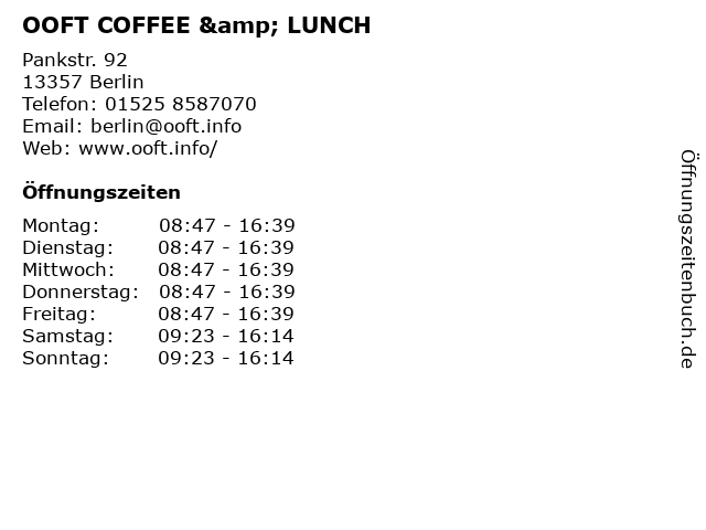 | Öffnungszeiten OOFT COFFEE & LUNCH in Berlin anzeigen | |