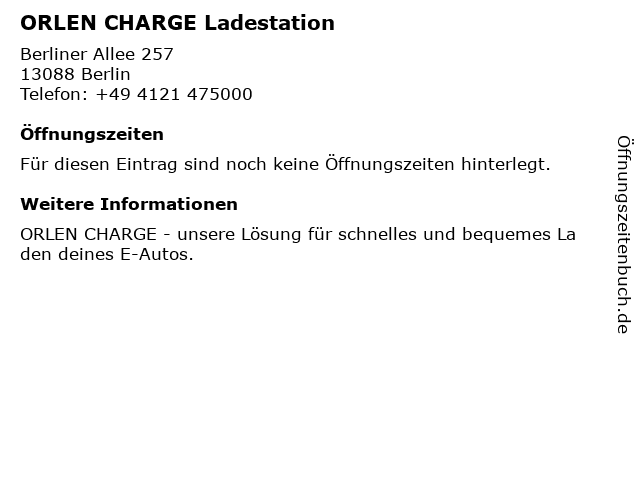 | Öffnungszeiten ORLEN CHARGE Ladestation in Berlin anzeigen | |