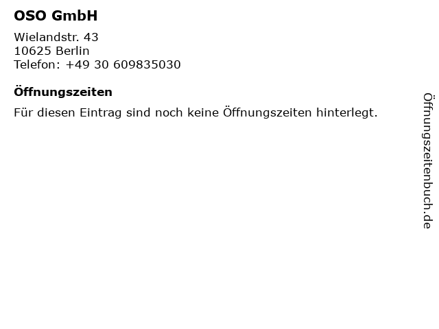| Öffnungszeiten OSO GmbH in Berlin anzeigen | |