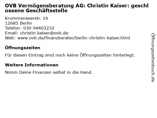 | OVB Vermögensberatung AG: Christin Kaiser: geschlossene Geschäftsstelle anrufen | |