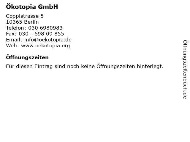 | Öffnungszeiten Ökotopia GmbH in Berlin anzeigen | |