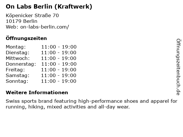 | Öffnungszeiten On Labs Berlin (Kraftwerk) in Berlin anzeigen | |
