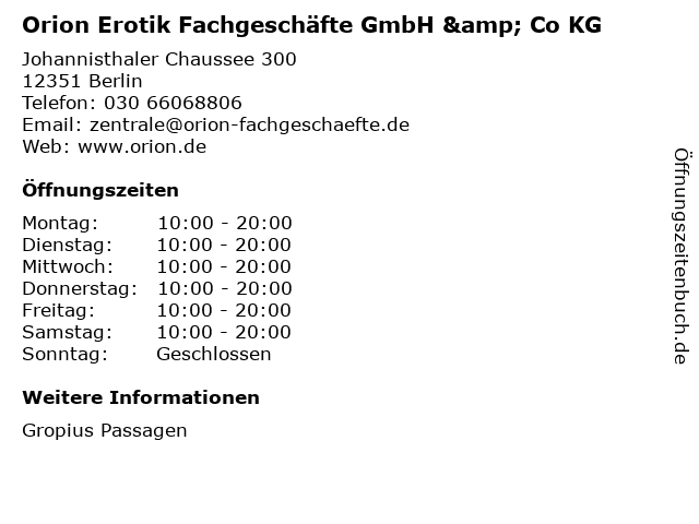 2 Orion Erotik Fachgeschäfte GmbH & Co KG (Entfernung: 16,95 km) Siemensadamm 43-44, 13629 Berlin-Siemensstadt 5 Kindertagesstätte Raumschiff Orion - Kindertagesstätten SüdOst Eigenbetrieb von Berlin (Entfernung: 5,60 km) Orionstraße 40, 12435 Berlin 6 |