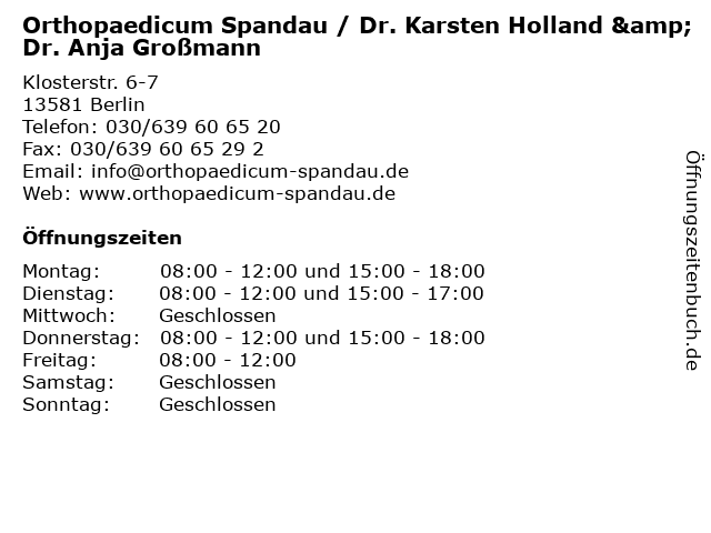 Branchen & Suchbegriffe zu Orthopaedicum Spandau / Dr. Karsten Holland & Dr. Anja Großmann:anja, arzt, dr., großmann, holland, karsten, med., medizin, orthopaedicum, orthopädie, spandau, sprechzeiten |