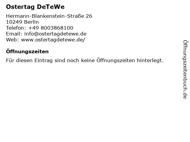 | Öffnungszeiten Ostertag DeTeWe in Berlin anzeigen | |