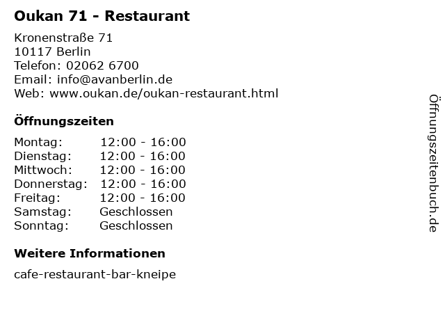 | Öffnungszeiten Oukan 71 - Restaurant in Berlin anzeigen | |