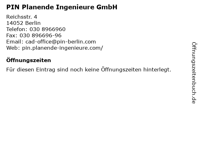 | Öffnungszeiten PIN Planende Ingenieure GmbH in Berlin anzeigen | |