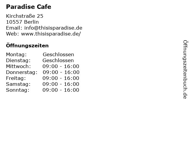 | Öffnungszeiten Paradise Cafe in Berlin anzeigen | |