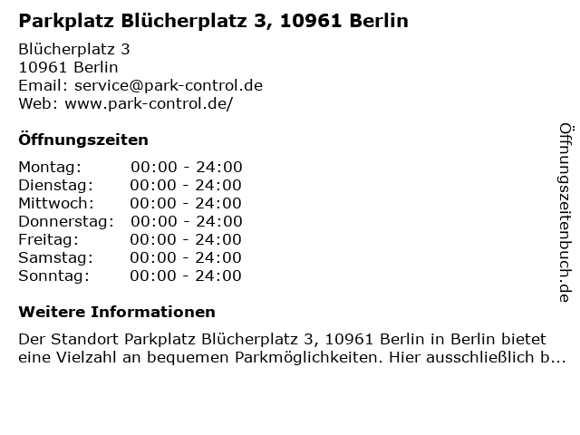 | Öffnungszeiten Parkplatz Blücherplatz 3, 10961 Berlin in Berlin anzeigen | |