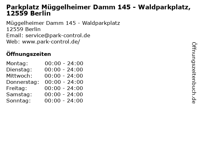 | Öffnungszeiten Parkplatz Müggelheimer Damm 145 - Waldparkplatz, 12559 Berlin in Berlin anzeigen | |