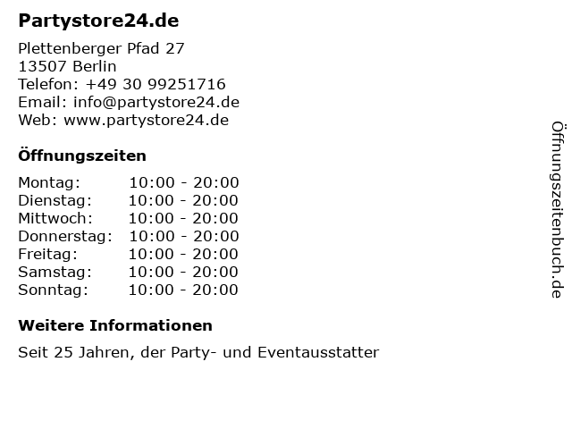 | Öffnungszeiten Partystore24.de in Berlin anzeigen | |