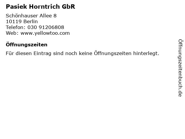 | Öffnungszeiten Pasiek Horntrich GbR in Berlin anzeigen | |