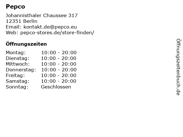 | Öffnungszeiten Pepco in Berlin anzeigen | |