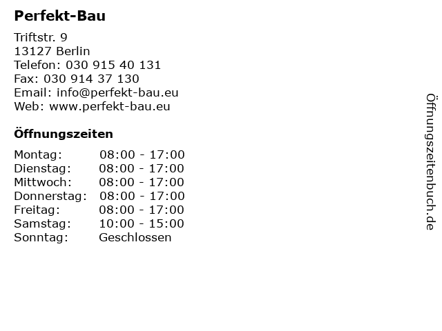 | Öffnungszeiten Perfekt-Bau in Berlin anzeigen | |