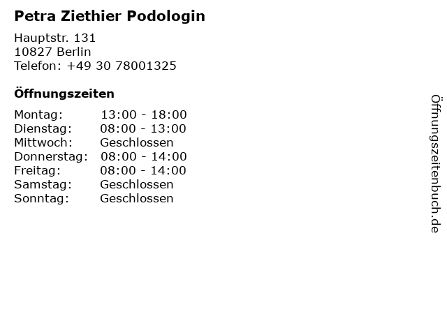| Öffnungszeiten Petra Ziethier Podologin in Berlin anzeigen | |
