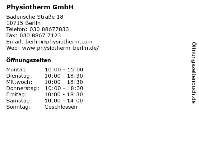 | Öffnungszeiten Physiotherm GmbH in Berlin anzeigen | |