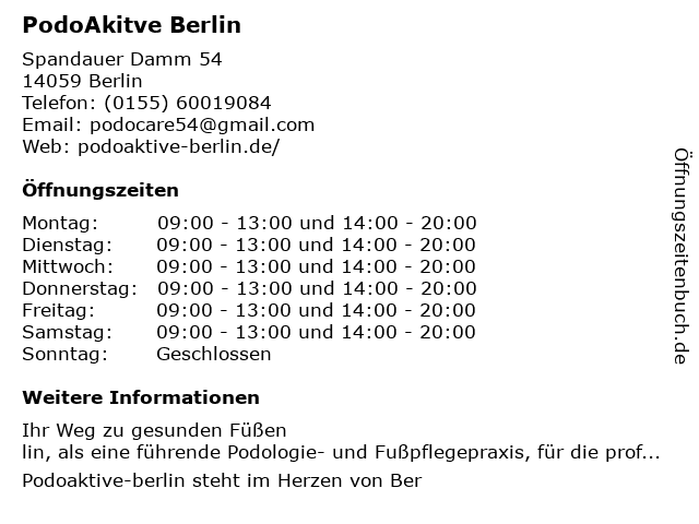 | Öffnungszeiten PodoAkitve Berlin in Berlin anzeigen | |