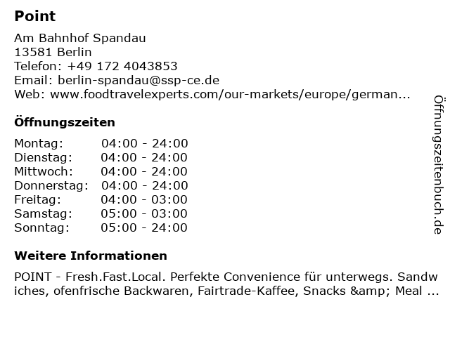 | Öffnungszeiten Point in Berlin anzeigen | |