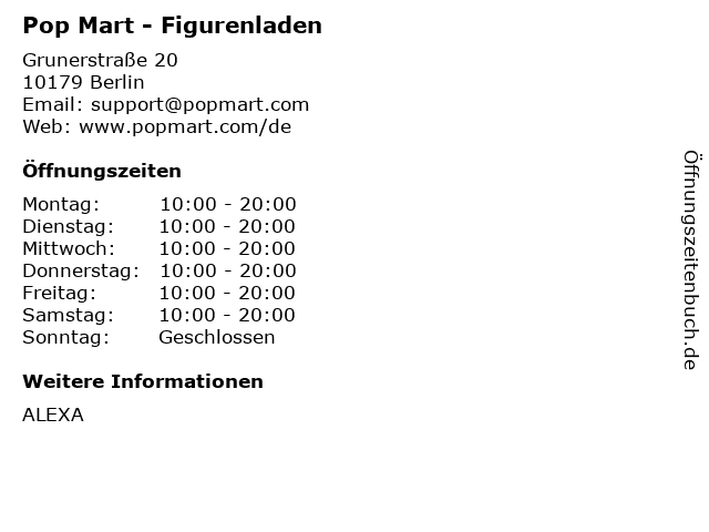 | Öffnungszeiten Pop Mart - Figurenladen in Berlin anzeigen | |