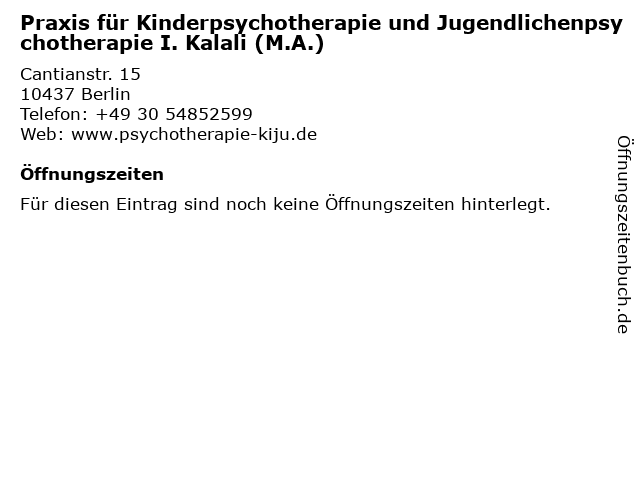 | Praxis für Kinderpsychotherapie und Jugendlichenpsychotherapie I. Kalali (M.A.) anrufen | |