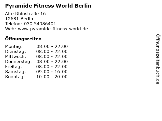 | Öffnungszeiten Pyramide Fitness World Berlin in Berlin anzeigen | |