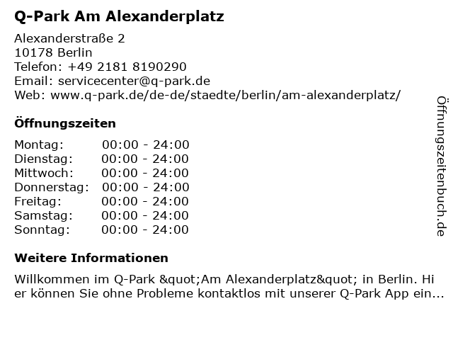 | Öffnungszeiten Q-Park Am Alexanderplatz in Berlin anzeigen | |