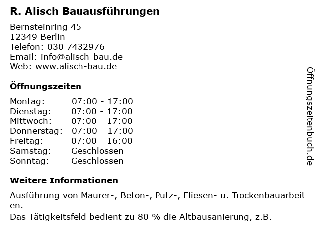 | Öffnungszeiten R. Alisch Bauausführungen in Berlin anzeigen | |