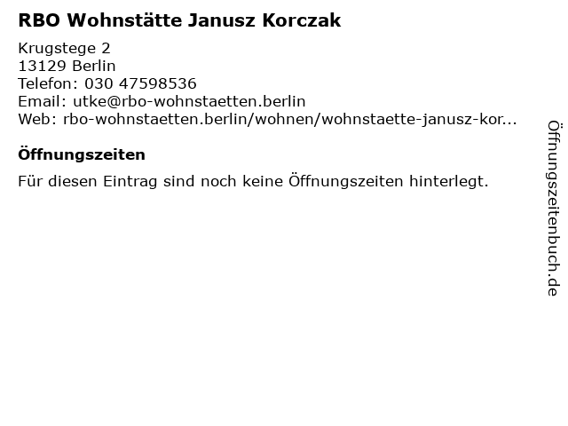 | Öffnungszeiten RBO Wohnstätte Janusz Korczak in Berlin anzeigen | |