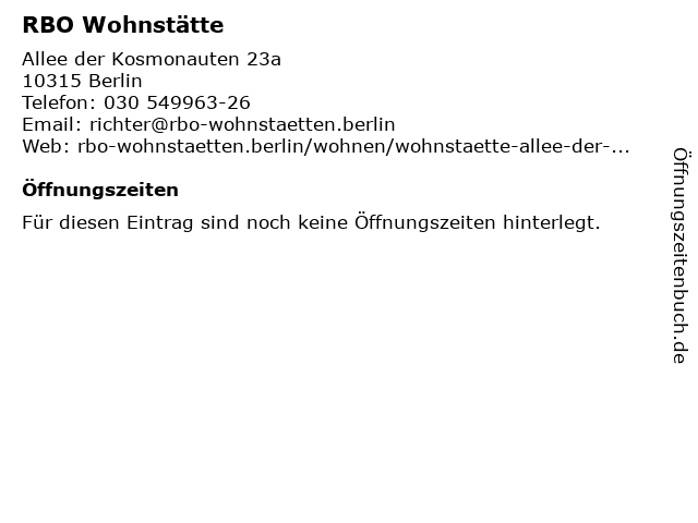 | Öffnungszeiten RBO Wohnstätte in Berlin anzeigen | |