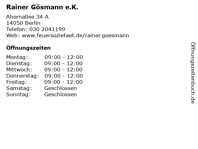 | Öffnungszeiten Rainer Gösmann e.K. in Berlin anzeigen | |