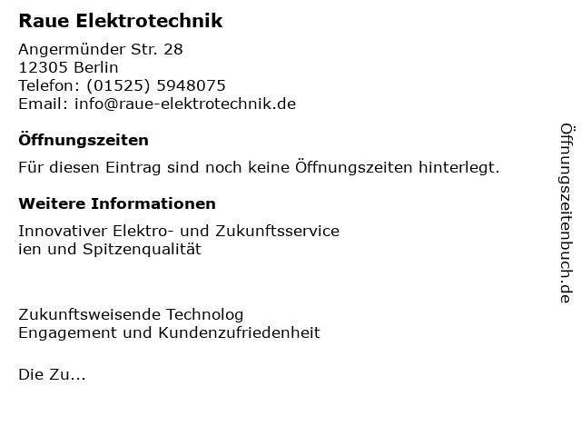| Öffnungszeiten Raue Elektrotechnik in Berlin anzeigen | |