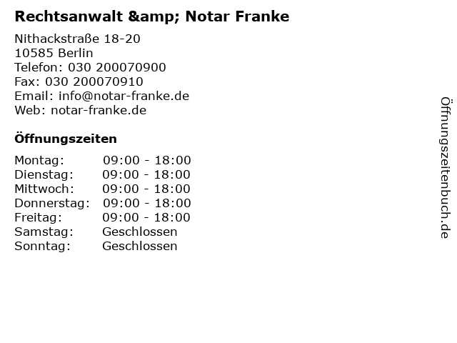 | Öffnungszeiten Rechtsanwalt & Notar Franke in Berlin anzeigen | |