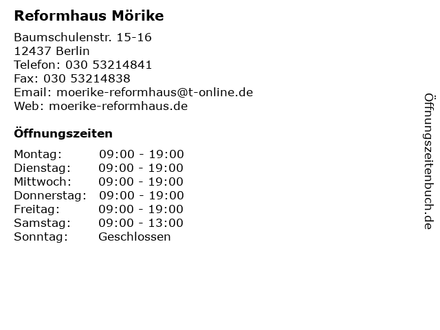 | Öffnungszeiten Reformhaus Mörike in Berlin anzeigen | |