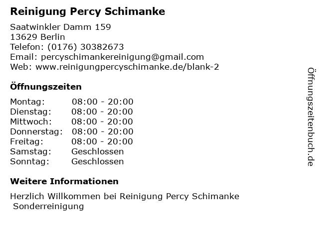 | Öffnungszeiten Reinigung Percy Schimanke in Berlin anzeigen | |