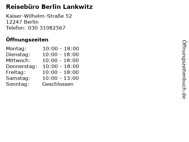 | Öffnungszeiten Reisebüro Berlin Lankwitz in Berlin anzeigen | |