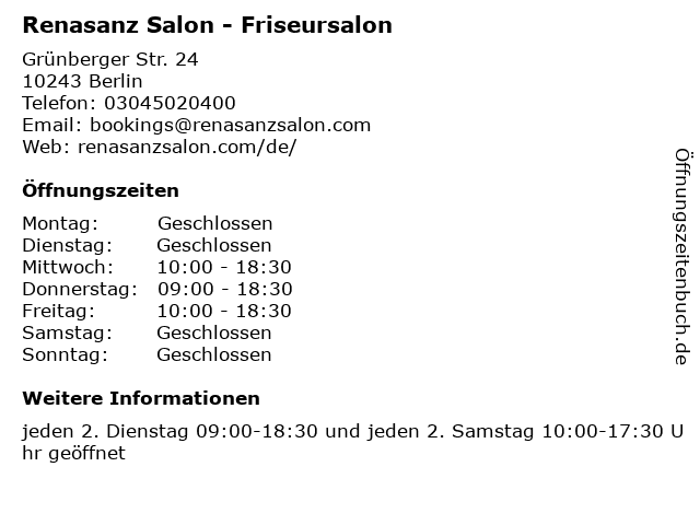 | Öffnungszeiten Renasanz Salon - Friseursalon in Berlin anzeigen | |