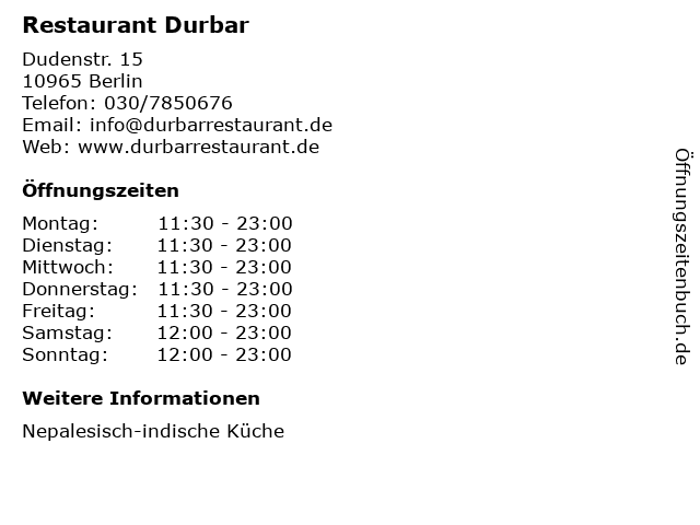 | Öffnungszeiten Restaurant Durbar in Berlin anzeigen | |