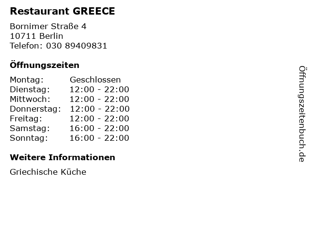 | Öffnungszeiten Restaurant GREECE in Berlin anzeigen | |