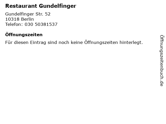 | Öffnungszeiten Restaurant Gundelfinger in Berlin anzeigen | |