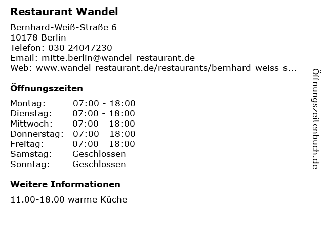| Öffnungszeiten Restaurant Wandel in Berlin anzeigen | |