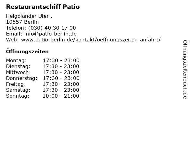 | Öffnungszeiten Restaurantschiff Patio in Berlin anzeigen | |