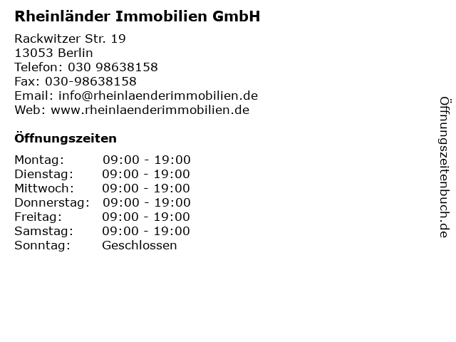 | Öffnungszeiten Rheinländer Immobilien GmbH in Berlin anzeigen | |