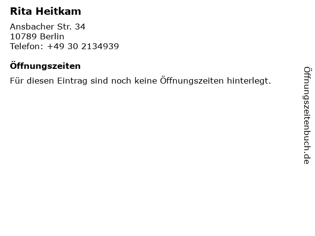 | Öffnungszeiten Rita Heitkam in Berlin anzeigen | |