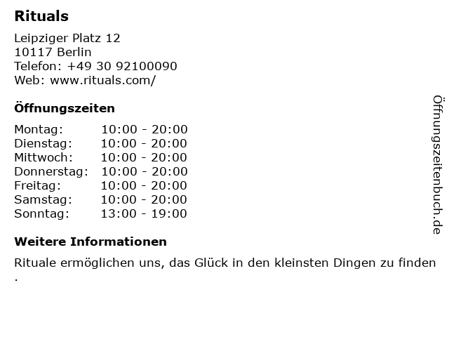 | Öffnungszeiten Rituals in Berlin anzeigen | |