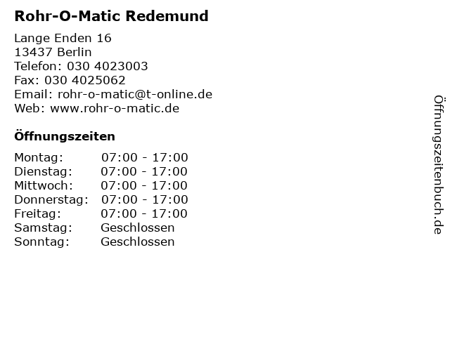 | Öffnungszeiten Rohr-O-Matic Redemund in Berlin anzeigen | |