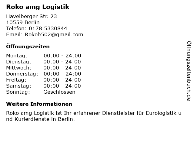 | Öffnungszeiten Roko amg Logistik in Berlin anzeigen | |