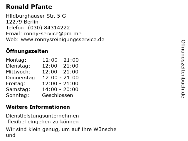| Öffnungszeiten Ronald Pfante in Berlin anzeigen | |