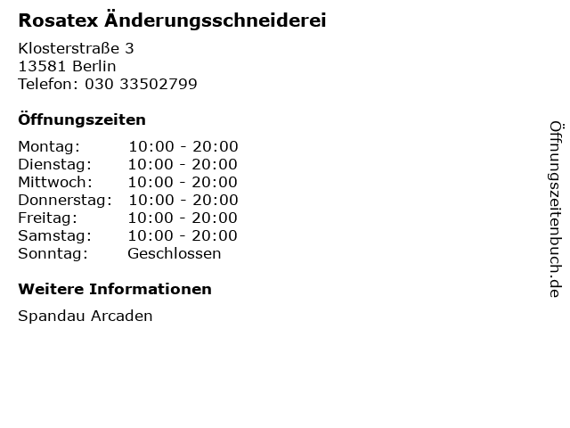 | Öffnungszeiten Rosatex Änderungsschneiderei in Berlin anzeigen | |